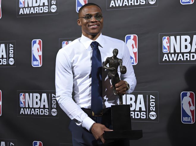 连续三个赛季场均三双,单赛季42次三双,2017年加冕常规赛MVP。除此之外,威少的荣誉榜单同样耀眼:2次最佳一阵、5次最佳二阵、2次最佳三阵,9届全明星、两次得分王、三次助攻王,同样入选了NBA历史75大巨星。